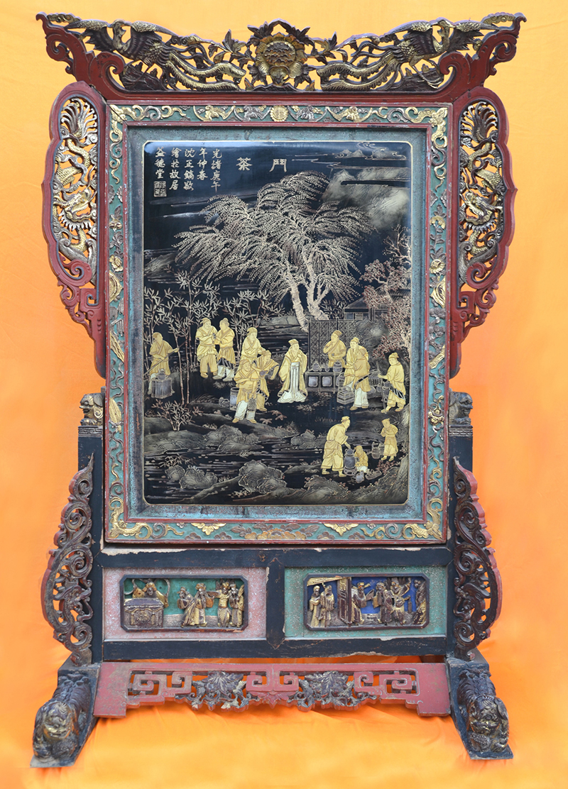 赖家几代珍藏的《斗茶图》台屏是福建福安白云山茶人组织斗茶场面的生动写照,山林野外小溪流潺,风光圣地斗茶意浓,场景人物性格、神情逼真,形象生动,画面上12个人物,有平民,有雅士,有商贾,貌似三人为一组,有大人有小孩,各自身旁放着自己带来的茶炉、茶具和茶叶。斗茶图上的人物都表现出一种积极乐观、谦虚礼让的精神风貌,体现出中国茶德"和"的思想核心,斗茶图台屏再现了清末白云山地区茶人斗茶的情景。